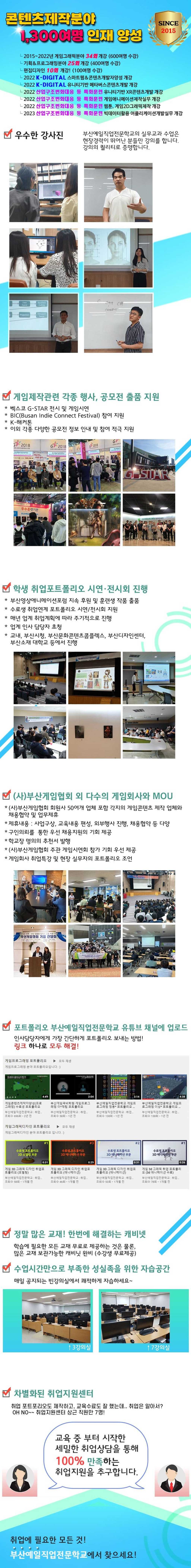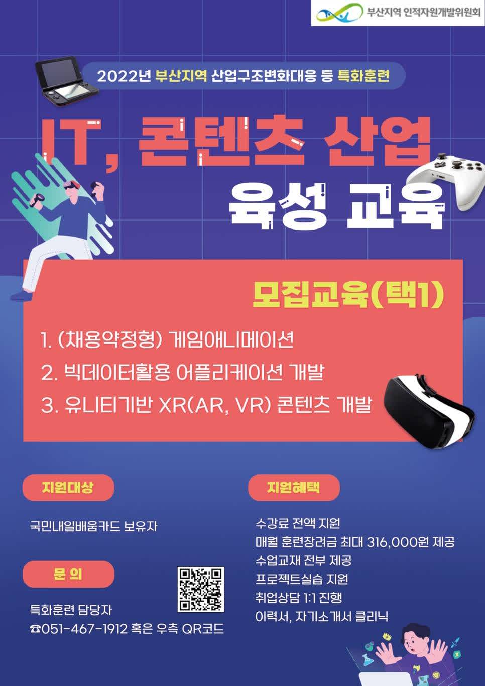 수강혜택 : 수강료 전액 국비 무료 매월 훈련장려금 + 특별수당 지급 사용 교재 전체 지원 포트폴리오 100% 확보 포트폴리오 발표회 개최 자습실 제공부산게임학원2015년부터 2022년까지 1300명 이상의 콘텐츠 제작 분야의 인재 양성의 비결!!부산 성원에서 경쟁력 있는 신입 게임 개발자/컨텐츠 제작자로 거듭나고 주세요부산VR학원+++https:// docs.google.com/forms/d/1C19YTuoXxii8f7pkW02CNP1nDhS75HkqXUBbTYYqj_4/edit2023부산 IT·콘텐츠 개발 실무 교육 신청 부산 이에일 직업 전문 학교가 운영하는 IT콘텐츠 실무 교육 신청 접수 페이지입니다. 본 교육은 부산 지역의 훈련 및 인력 수요가 높은 직종에 취업을 장려하기 위한 훈련에서 최신 수요에 맞춘 효율적인 커리큘럼과 프로젝트 실습 지원이 큰 장점입니다. 지원 대상-국민 내일 학습 카드 소지자*실업 급여 수급자, 기타 정부 프로그램 참가자 신청 가능 과정 1:유니티 기반 XR콘텐츠 제작 실무-프로그래밍 기초 언어(C, C++, C##)-유니티 게임 엔진 프로그래밍, 서버 프로그램-실감형 콘텐츠 기획, 유니티 XR환경 구축-프로젝트···docs.google.com홈페이지http://www.gamebusan.com/edu_1.html?gubun=CUnity 3D콘텐츠 개발 웹/앱 프로그래밍 그래픽, 메타 버스 콘텐츠 Unity 3D콘텐츠 개발 교육 과정 Unity 3D콘텐츠 개발 XR(AR/VR)실감형 콘텐츠 유니티 기반 XR콘텐츠 개발 실무·교육 기간:2023년 03월 13일~2023년 08월 30일 월~금/8교시·모집 인원:30명·수강료:8,261,760원/본인 부담금:0원[K-디지털]UNIITY기반 메타 버스 콘텐츠 개발·교육 기간:2023년 04월 24일~2023년 11월 14일 월~금/8시간째·수강료:25시간째···www.gamebusan.com교육문의 051-467-1912 카카오톡: http://pf.kakao.com/_UfvnC부산예일직업전문학교 취업준비는 _OO에서 무역물류, 게임개발, 그래픽디자인, 웹개발, 메타버스, VR, 관광MICE, 마케팅 pf.kakao.com부산예일직업전문학교 취업준비는 _OO에서 무역물류, 게임개발, 그래픽디자인, 웹개발, 메타버스, VR, 관광MICE, 마케팅 pf.kakao.com부산예일직업전문학교 취업준비는 _OO에서 무역물류, 게임개발, 그래픽디자인, 웹개발, 메타버스, VR, 관광MICE, 마케팅 pf.kakao.com